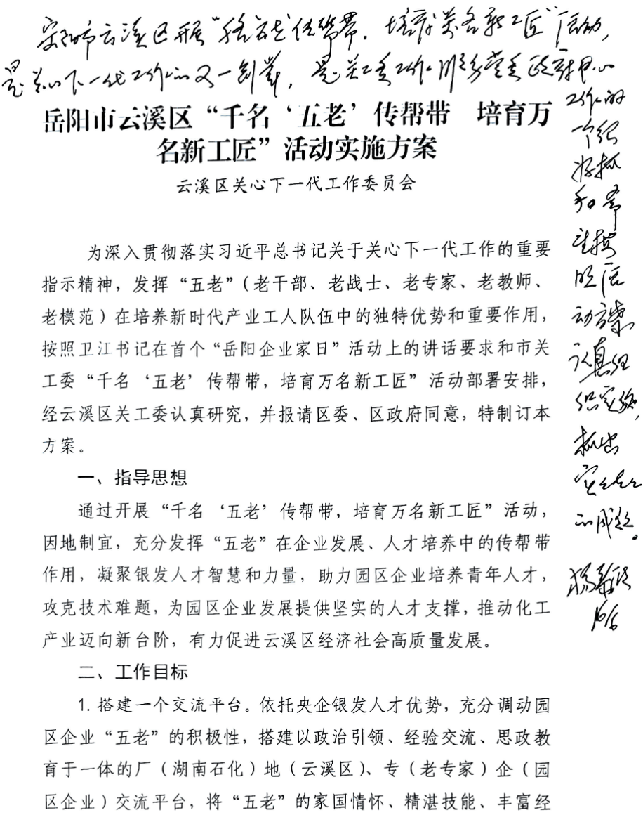 “千名‘五老’传帮带,培育万名新工匠” 活动倡议书尊敬的各位“五老”、企业界的青年朋友、企业家们:为深入贯彻习近平总书记关于关心下一代工作的一系列指示批示精神,积极响应市关工委的号召,我们在此郑重发起 “千名‘五老’(老干部、老战士、老专家、老教师、老模范)传帮带,培育万名新工匠”活动倡议! “五老”引领,传承匠心。各位“五老”是云溪石化产业发展的中流砥柱,是云溪大地上行走的奋斗史书,你们用智慧与汗水铸就了云溪的辉煌,身上所承载的工匠精神和家国情怀,是后辈们取之不尽的精神宝藏。在此,我们衷心呼吁各位“五老”,秉持“甘为人梯” 的高尚情怀,积极投身到传帮带活动中来。将自己多年积累的丰富经验、精湛技艺以及对工作的执着与热爱,毫无保留地传授给云溪的青年一代,成为他们职业生涯中的“引路人”,让青年工匠们在你们的带领下茁壮成长。青年奋进,砥砺前行。青年是云溪石化产业的未来之星,肩负着推动云溪高质量发展的重任。“千名‘五老’传帮带,培育万名新工匠”活动,为青年朋友搭建了难得的成长平台。希望你们主动向“五老”请教,虚心聆听教诲,认真学习技术,用心领悟工匠精神的内涵,通过不断的实践与探索,锻造属于自...