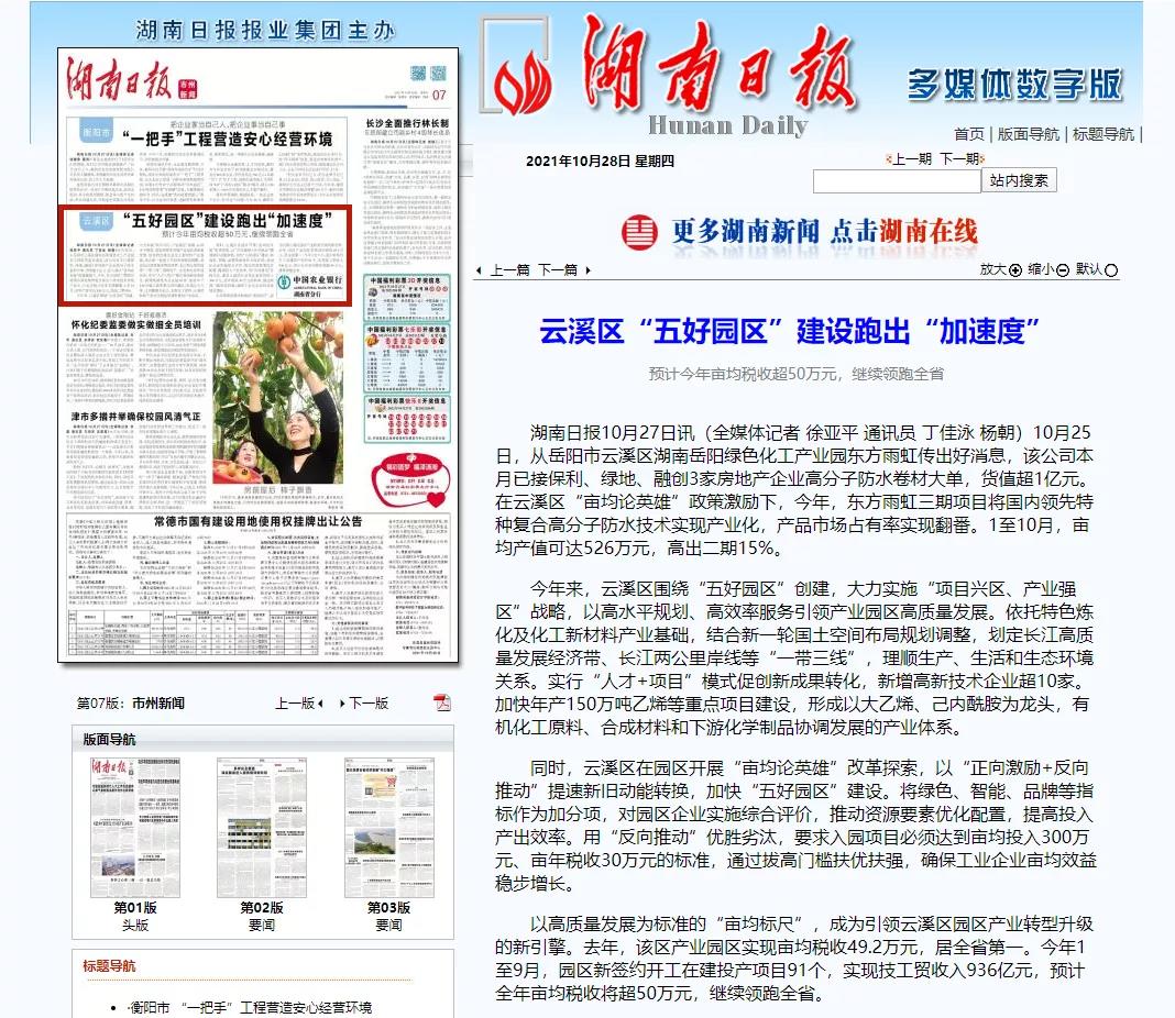 云溪区“五好园区”建设跑出“加速度”预计今年亩均税收超50万元,继续领跑全省10月25日,从岳阳市云溪区湖南岳阳绿色化工产业园东方雨虹传出好消息,该公司本月已接保利、绿地、融创3家房地产企业高分子防水卷材大单,货值超1亿元。在云溪区“亩均论英雄”政策激励下,今年,东方雨虹三期项目将国内领先特种复合高分子防水技术实现产业化,产品市场占有率实现翻番。1至10月,亩均产值可达526万元,高出二期15%。今年来,云溪区围绕“五好园区”创建,大力实施“项目兴区、产业强区”战略,以高水平规划、高效率服务引领产业园区高质量发展。依托特色炼化及化工新材料产业基础,结合新一轮国土空间布局规划调整,划定长江高质量发展经济带、长江两公里岸线等“一带三线”,理顺生产、生活和生态环境关系。实行“人才+项目”模式促创新成果转化,新增高新技术企业超10家。加快年产150万吨乙烯等重点项目建设,形成以大乙烯、己内酰胺为龙头,有机化工原料、合成材料和下游化学制品协调发展的产业体系。