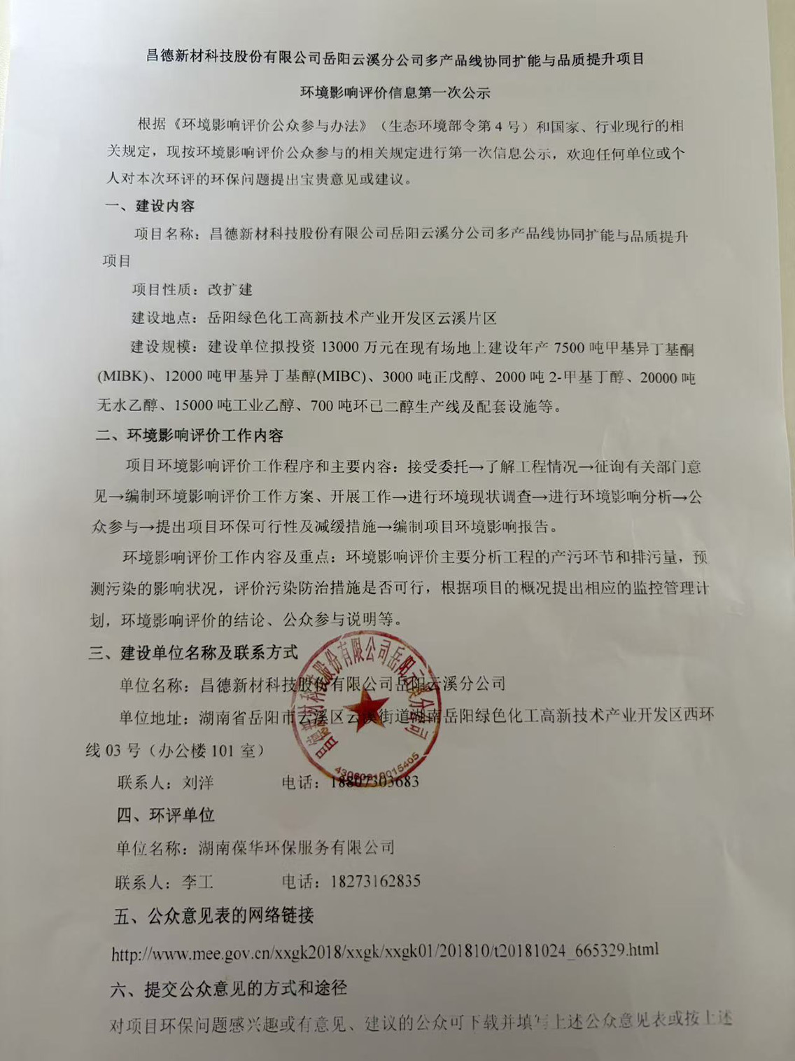岳阳市昌环化工科技发展有限公司改性燃料油生产技改项目第二次环评公示
