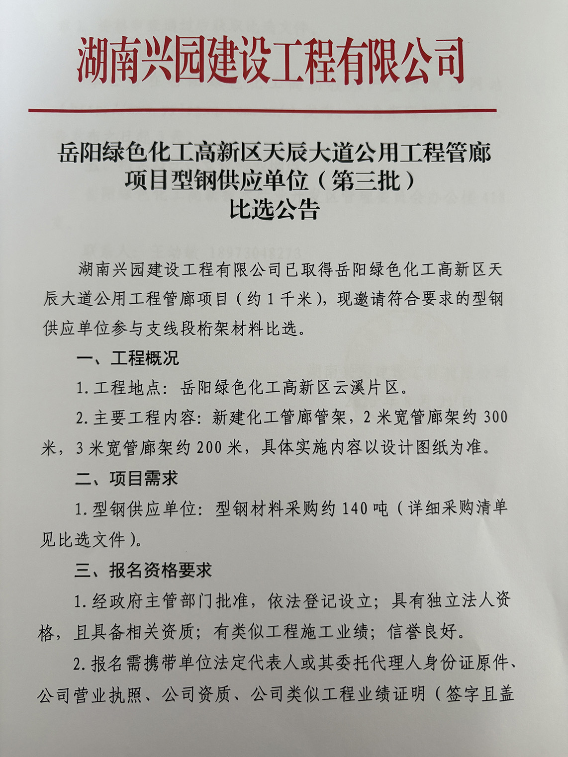 下一篇:岳阳绿色化工高新区天辰大道公用工程管廊项目型钢供应单位(第二批)比选公告