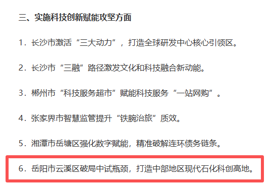 为进一步深入贯彻落实上级精神,打造中部地区现代石化科技创新高地,岳阳市决定以系统集成、深化改革的方式建设湖南现代石化中试基地,2024年10月21日,湖南现代石化中试基地在岳阳绿色化工高新区揭牌成立。