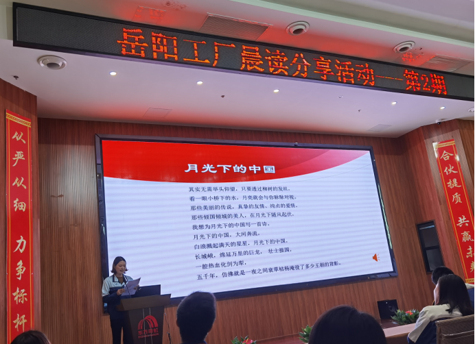 一首《月光下的中国》拉开了本次读书分享活动的序幕。通过月光的照耀,描绘了在中国共产党的领导下一个宁静、温柔、祥和且美丽的中国形象。不仅表达了对祖国繁荣富强的深沉热爱,而且展现了对中国底蕴深厚的历史文化的自豪。同时,也反映了改革开放和社会主义现代化建设的伟大成就,以及对美好未来的无限向往,更是提升了公司党员干部职工的“四个自信”。
